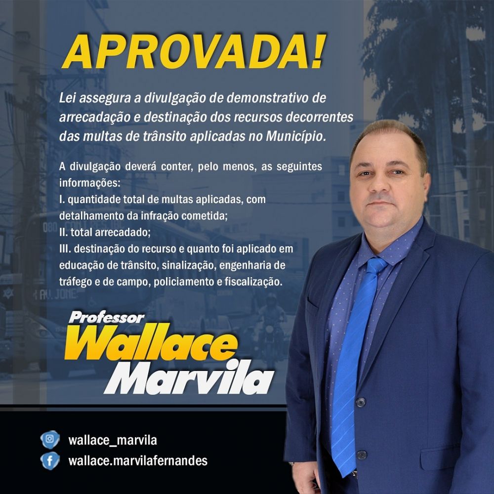 O projeto lei do Vereador Wallace Marvila que assegura a divulgação de demonstrativo de arrecadação e destinação dos recursos decorrentes das multas de trânsito aplicadas no município de Cachoeiro de Itapemirim (E.S), foi aprovado pela Câmara Municipal e entra em vigor 60 dias após sua publicação.