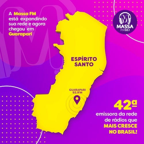 Por fim, já no dia 29, entrará no ar a Massa FM 90.9 de Cachoeiro de Itapemirim, no sul capixaba. A praça é o mercado mais populoso no interior do Espírito Santo.