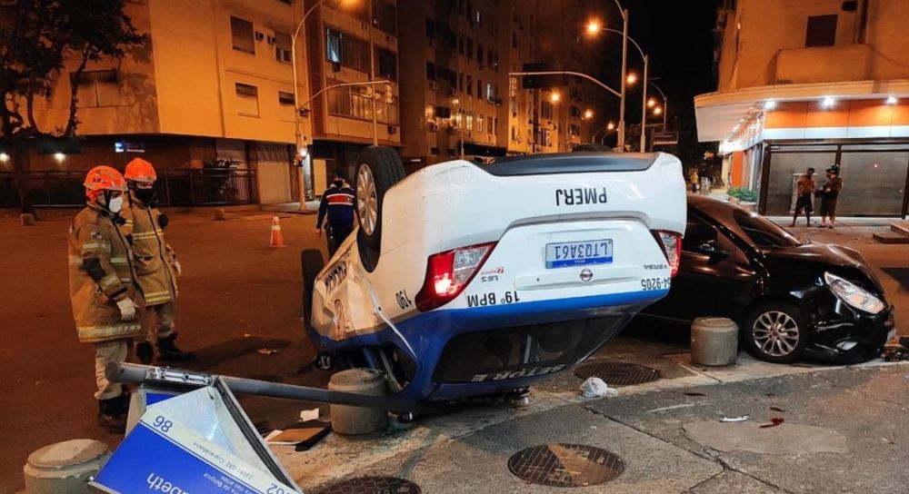 Uma viatura da Polícia Militar capotou em um acidente na esquina entre as ruas Nossa Senhora de Copacabana e Rainha Elizabeth, em Copacabana, na Zona Sul do Rio, na noite desta terça-feira (21).