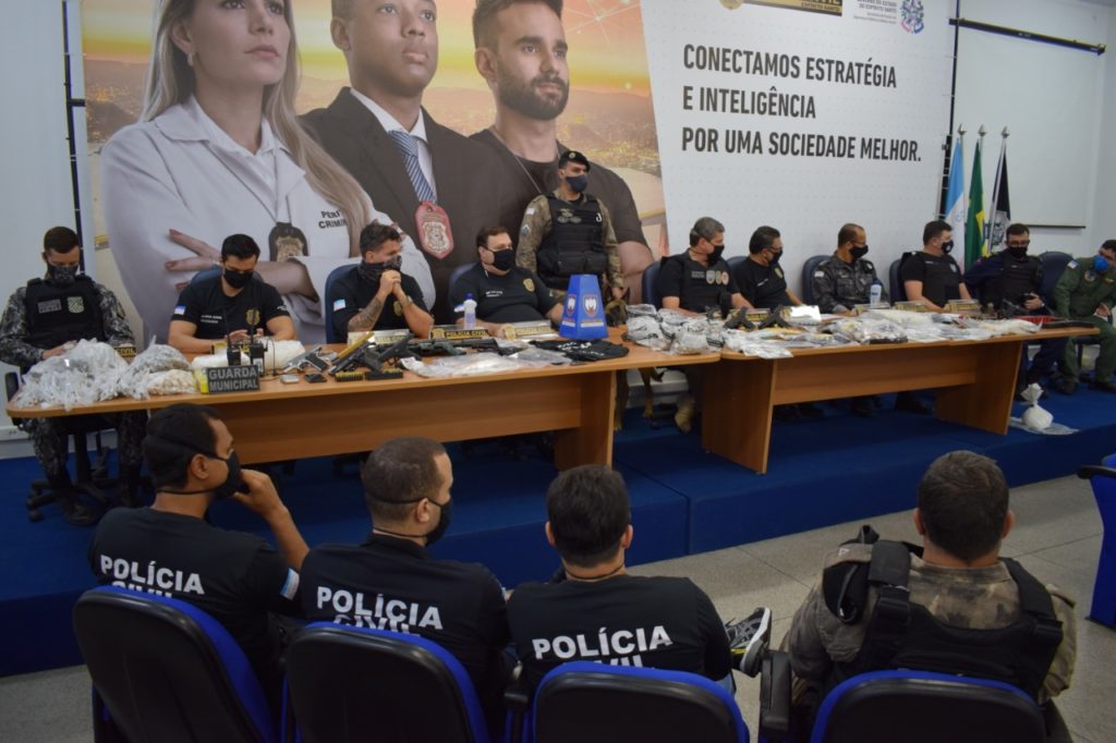 Foram encontrados na operação 23 armas, 425 munições, R$ 30.297,00 reais em espécie, roupa de policial civil, rádios comunicadores, balança de precisão, 295 gramas e 2.200 buchas de maconha, 465 gramas e 716 papelotes de cocaína, 800 gramas e 1.037 pedras de crack, além de material para embalo da droga, que foram apreendidos.
